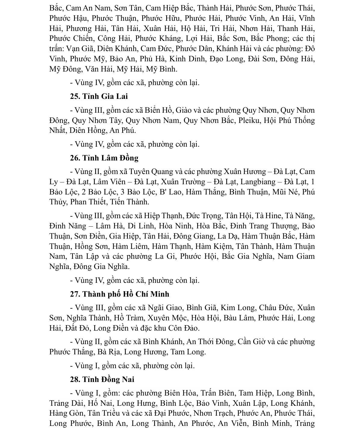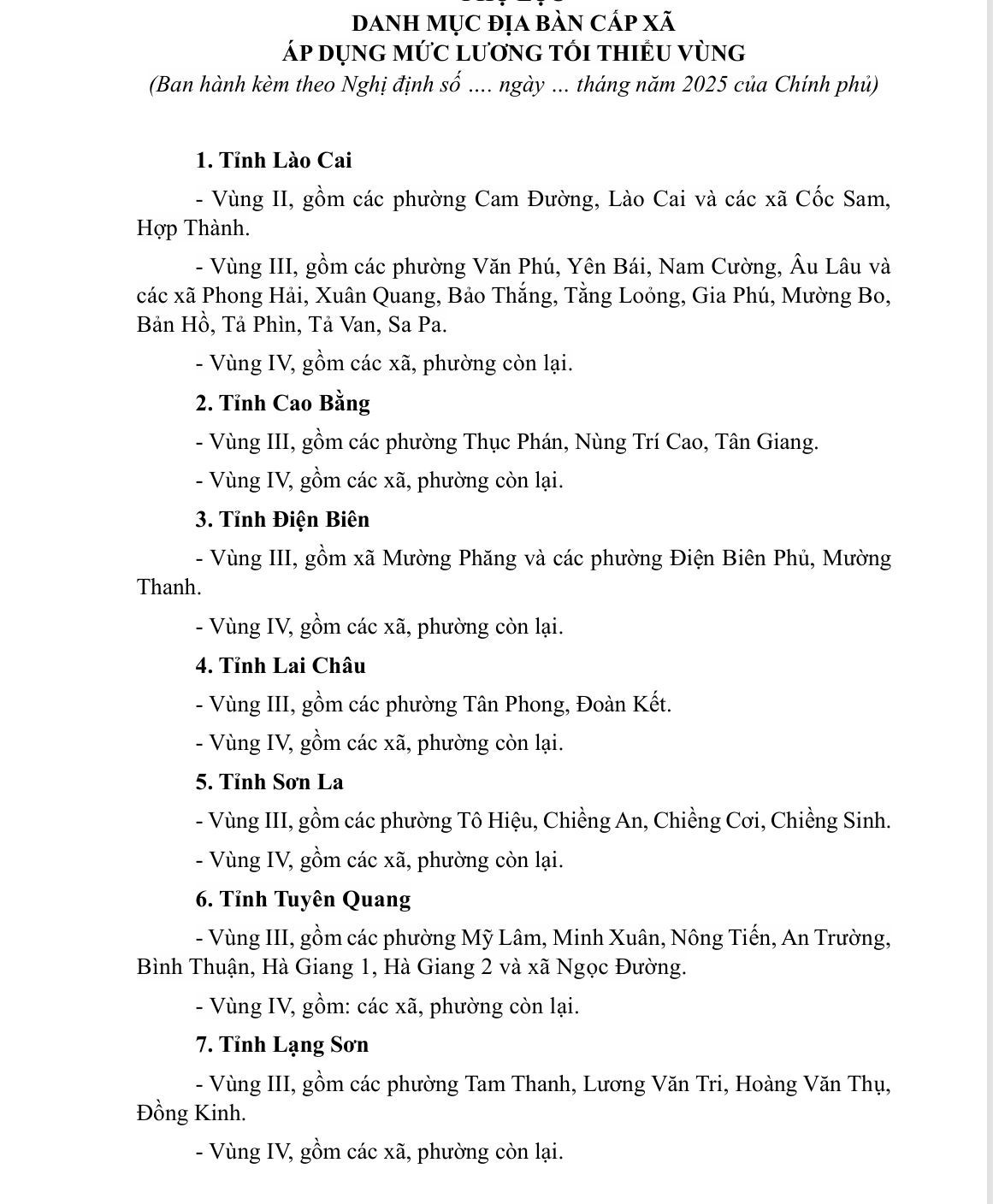 Trong dự thảo Nghị định đã ban hành Phụ lục danh mục địa bàn các xã (giữ nguyên trạng hoặc hình thành mới sau ngày 1-7-2025) để áp dụng mức lương tối thiểu theo 4 vùng quy định tại Nghị định số 74/2024/NĐ-CP. Theo đó, danh sách các vùng sẽ được điều chỉnh theo danh sách các đơn vị hành chính cấp xã, cấp tỉnh mới sau sắp xếp.
