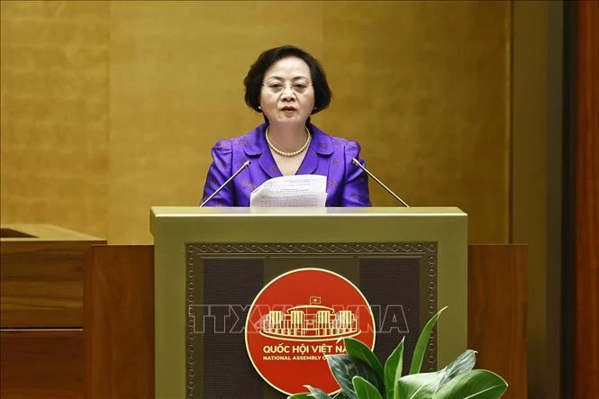 Bộ trưởng Bộ Nội vụ Phạm Thị Thanh Trà trình bày Tờ trình về việc sắp xếp đơn vị hành chính cấp tỉnh năm 2025. Ảnh: Doãn Tấn/TTXVN.