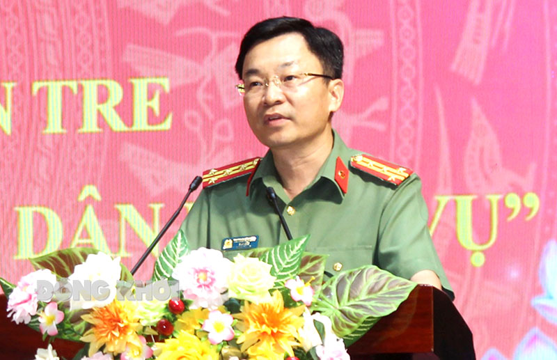 Đại tá Trương Sơn Lâm - Bí thư Đảng ủy, Giám đốc Công an tỉnh báo cáo nội dung chủ đề “Trọng dân, gần dân, vì nhân dân phục vụ”, được cụ thể hóa từ 6 điều Bác Hồ dạy Công an nhân dân (CAND). Nhiều năm liền, 6 điều Bác Hồ dạy CAND đã được Công an tỉnh quán triệt, vận dụng sâu sắc trong toàn lực lượng, gắn với thực tiễn công tác và các phong trào thi đua; góp phần xây dựng lực lượng CAND thực sự trong sạch, vững mạnh, chính quy, tinh nhuệ, hiện đại, đáp ứng với yêu cầu, nhiệm vụ trong tình hình mới.
