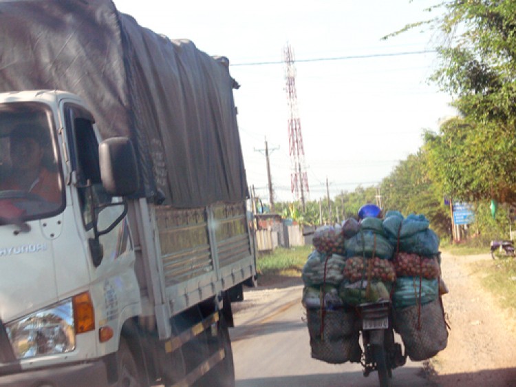 | Xe gắn máy chở cồng kềnh chiếm hết lối đi rất dễ gây tai nạn giao thông. Ảnh: Thu Huyền |