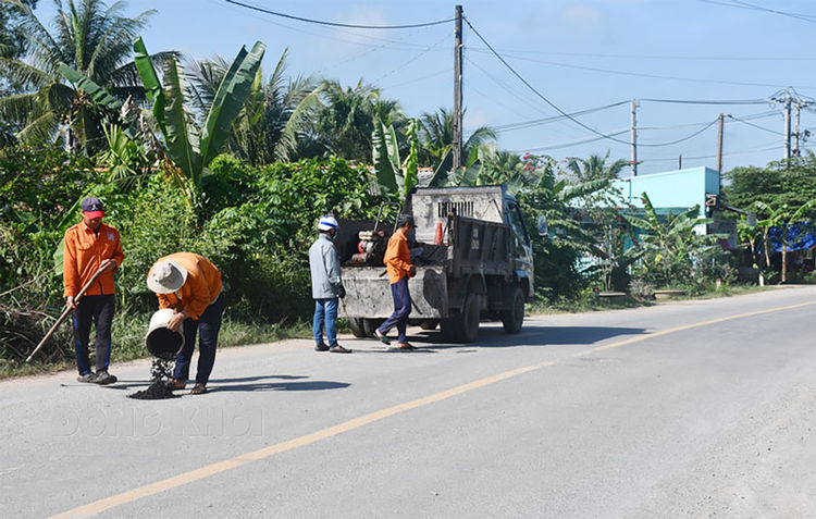 Dặm vá tuyến đường ở xã An Khánh, huyện Châu Thành để đảm bảo an toàn giao thông trong dịp Tết 2023.