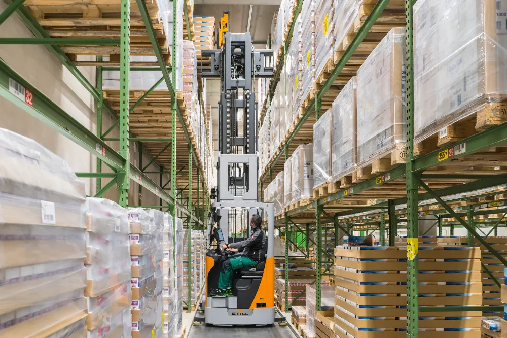 Xe nâng lối đi hẹp (xe nâng VNA): Xe nâng lối đi hẹp được thiết kế để hoạt động trong các kho hàng có lối đi rất hẹp, thường dưới 2 mét và độ cao nâng lên tới 18 mét. Phương tiện này cho phép tối ưu hóa không gian lưu trữ bằng cách giảm khoảng cách giữa các kệ hàng.