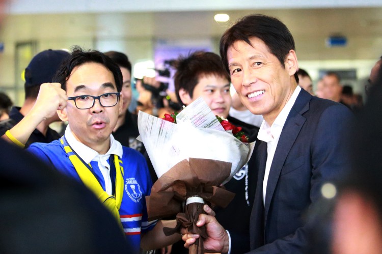Một số CĐV Thái Lan có mặt ở sân bay từ trước, đón tiếp và tặng hoa cho HLV Akira Nishino. Ảnh: VnExpress