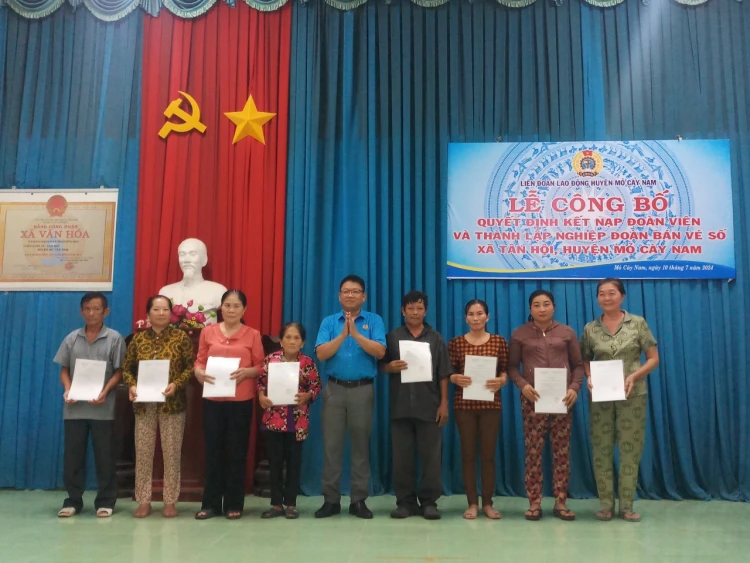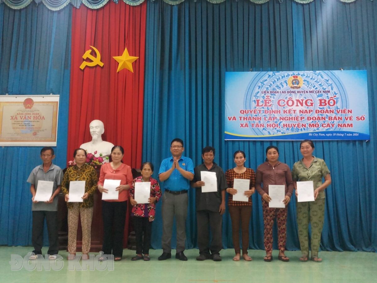 BDK - Chiều 10-7-2024, Liên đoàn Lao động huyện Mỏ Cày Nam tổ chức lễ công bố quyết định kết nạp đoàn viên và thành lập Nghiệp đoàn Bán vé số xã Tân Hội. Đây là nghiệp đoàn bán vé số đầu tiên của tỉnh Bến Tre nói chung và huyện Mỏ Cày Nam nói riêng.