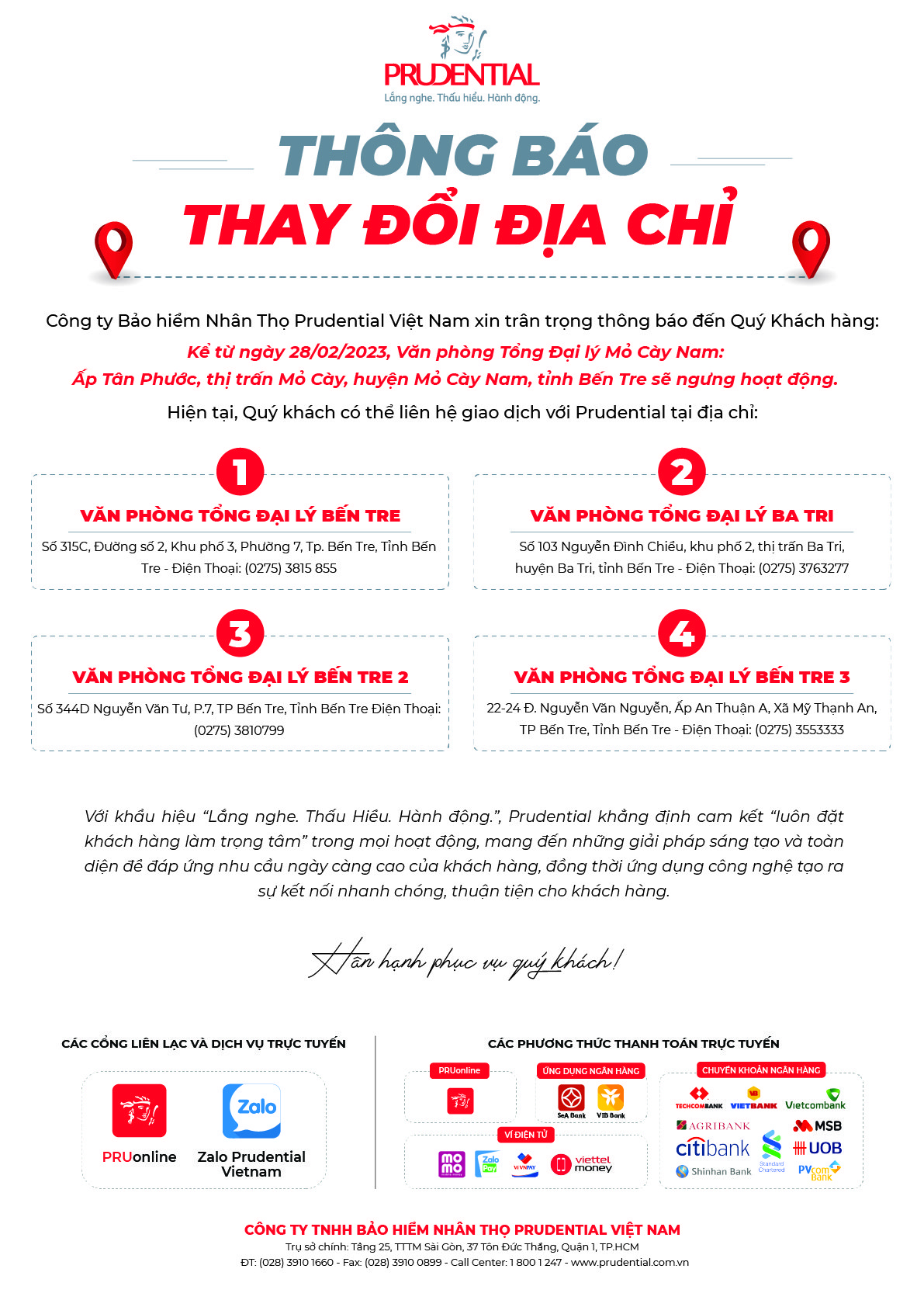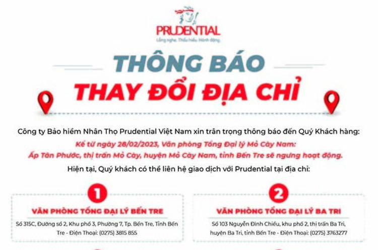 BDK.VN - Công ty Bảo hiểm Nhân Thọ Prudential Việt Nam xin trân trọng thông báo đến Quý Khách hàng: Kể từ ngày 28-2-2023, Văn phòng Tổng Đại lý Mỏ Cày Nam: Ấp Tân Phước, thị trấn Mỏ Cày, huyện Mỏ Cày Nam, tỉnh Bến Tre sẽ ngưng hoạt động.