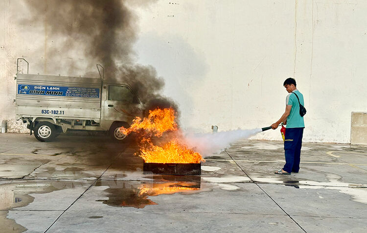 BDK - Phòng Cảnh sát phòng cháy, chữa cháy và cứu nạn, cứu hộ (PCCC&CNCH) Công an tỉnh phối hợp với Chi nhánh Công ty TNHH Cao Phong (Siêu thị điện máy Chợ Lớn Bến Tre) vừa tổ chức thực tập phương án CC&CNCH tại công ty có địa chỉ số 171D Võ Nguyên Giáp, ấp Bình Thành, xã Bình Phú, TP. Bến Tre.