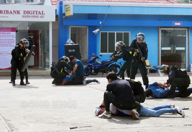 Tình huống giả định khoảng 15 giờ ngày N có 3 đối tượng đi xe máy cải trang là khách hàng đến giao dịch tại Agribank Chi nhánh tỉnh, với ý định chờ thời cơ, sử dụng vũ khí khống chế nhân viên và khách hàng đến giao dịch, nhằm mục đích cướp tài sản.