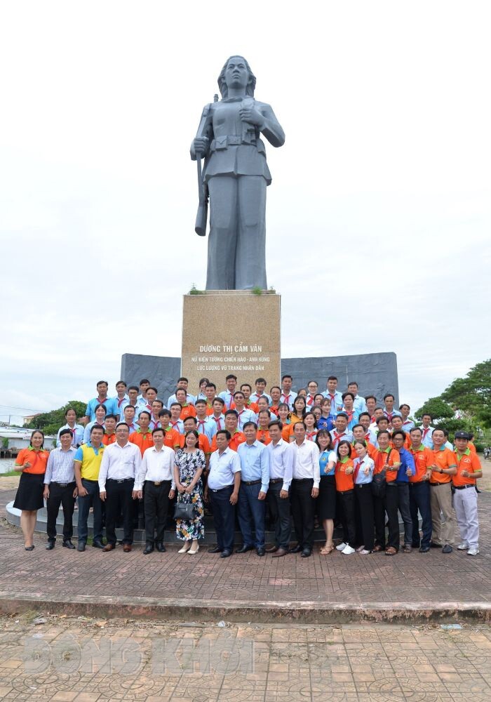 Hai đơn vị chụp ảnh lưu niệm tại tượng đài nữ kiện tướng chiến hào, Anh hùng lực lượng vũ trang Nhân dân Dương Thị Cẩm Vân. Ảnh: Nguyễn Hiệp.