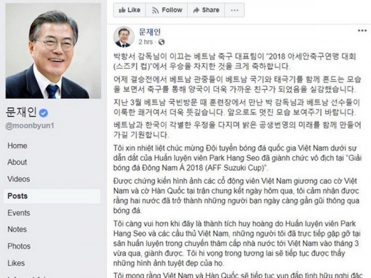 Trên trang Facebook cá nhân ngày 16-12-2018, Tổng thống Moon Jae-in đã chúc mừng chiến thắng của đội tuyển bóng đá quốc gia Việt Nam tại giải vô địch bóng đá Đông Nam Á (AFF Cup).