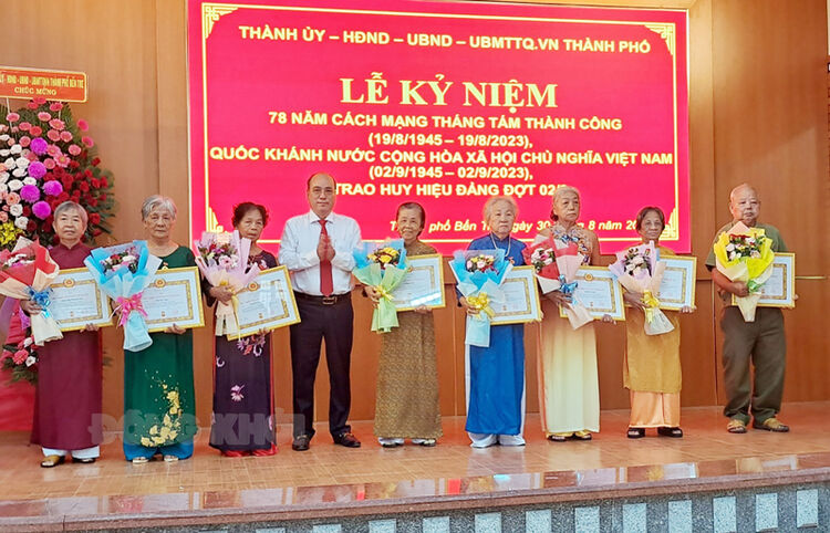Bí thư Thành ủy TP. Bến Tre Nguyễn Văn Tuấn trao Huy hiệu Đảng đợt 2-9 cho các đảng viên.