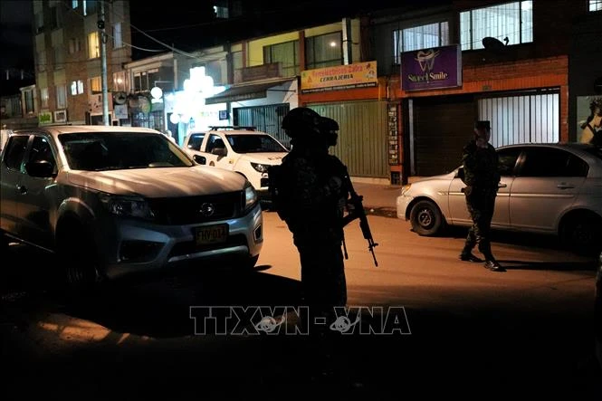 Cảnh sát tuần tra tại hiện trường ứng viên tranh cử Tổng thống Colombia, Thượng nghị sĩ Miguel Uribe bị bắn trọng thương ở Bogota, ngày 7-6-2025. Ảnh: THX/TTXVN