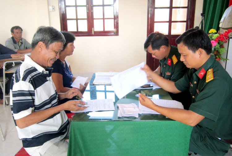 Trung úy Nguyễn Phúc Tùng (hàng đầu, bên phải) cấp phát tiền cho đối tượng chính sách. Ảnh: Đặng Thạch