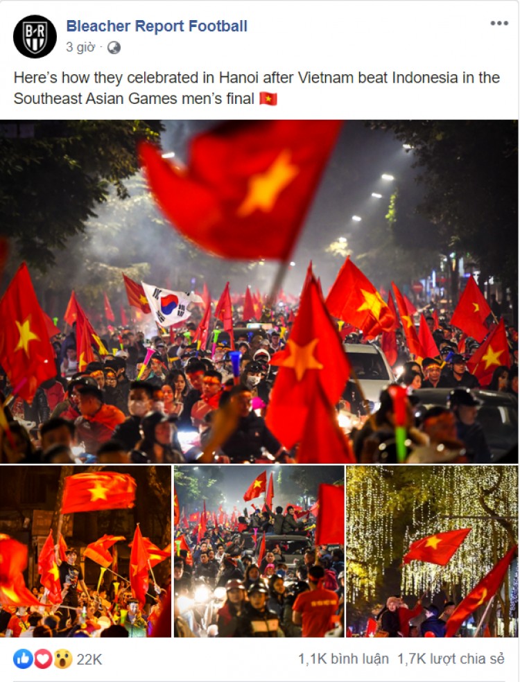 Bài đăng "Đây là cách người Hà Nội ăn mừng chiến thắng của Việt Nam trước Indonesia ở chung kết bóng đá nam SEA Games" thu hút hàng chục nghìn lượt tương tác chỉ sau 3 giờ đồng hồ, trong đó đa phần các CĐV trên thế giới đều chung vui với người Việt.