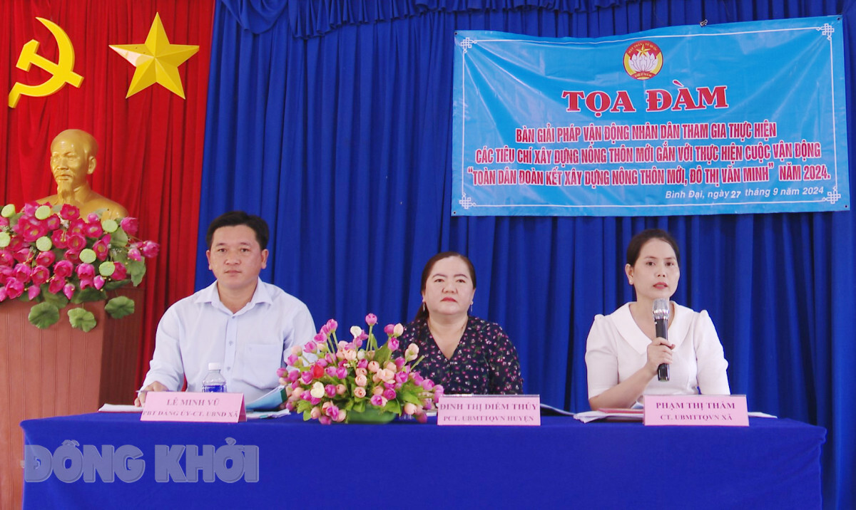 BDK.VN - Ủy ban MTTQ Việt Nam huyện Bình Đại vừa tổ chức tọa đàm bàn giải pháp vận động nhân dân tham gia thực hiện các tiêu chí xây dựng nông thôn mới (NTM) gắn với thực hiện cuộc vận động “Toàn dân đoàn kết xây dựng NTM, đô thị văn minh” tại 2 xã Bình Thắng và Thạnh Trị.