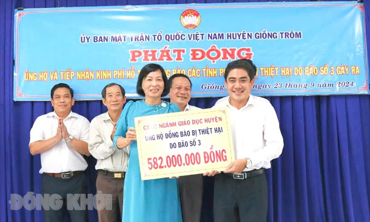 Gần đây, hưởng ứng đợt vận động tiền ủng hộ đồng bào các tỉnh phía Bắc khắc phục hậu quả sau cơn bão số 3 theo phát động của Ủy ban MTTQ Việt Nam tỉnh, MTTQ Việt Nam huyện Giồng Trôm cùng các đoàn thể đã tích cực tuyên truyền, vận động trong cán bộ, công chức, viên chức, người lao động và nhân dân hưởng ứng với tổng số tiền 2,317 tỷ đồng.