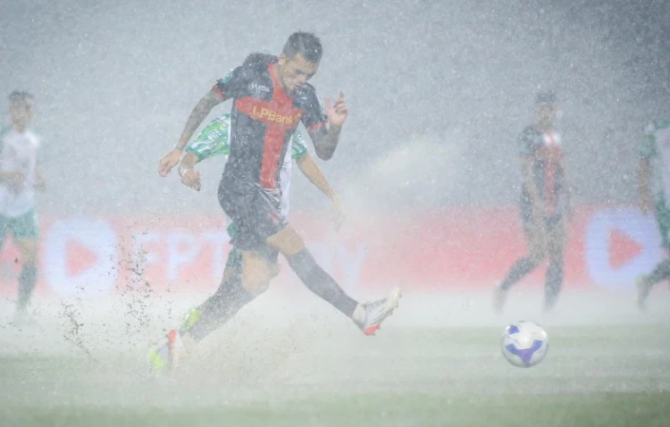 Tới phút thứ 33, trận đấu phải tạm hoãn do ảnh hưởng của cơn mưa lớn trên sân Thống Nhất. Sau khoảng 20 phút trận đấu trở lại song tình hình mặt cỏ đã khiến chất lượng chuyên môn của trận đấu phần nào bị giảm sút. Ở hiệp đấu này, hai đội vẫn không tạo ra được quá nhiều tình huống nguy hiểm nhưng đội khách đã biết chắt chiu cơ hội hơn.