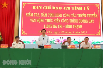 Ngày 29-5-2025, tại hội trường Huyện ủy huyện Thạnh Phú, Ban Chỉ đạo công tác tuyên truyền, vận động thực hiện các công trình, dự án trọng điểm trên địa bàn tỉnh (Ban Chỉ đạo 428 tỉnh) do Phó bí thư Thường trực Tỉnh ủy Trần Thanh Lâm - Trưởng Ban Chỉ đạo 428 tỉnh làm trưởng đoàn đã kiểm tra, nghe báo cáo tiến độ công tác tuyên truyền, vận động thực hiện công trình Đường dây 110kV Ba Tri - Bình Thạnh (Thạnh Phú).