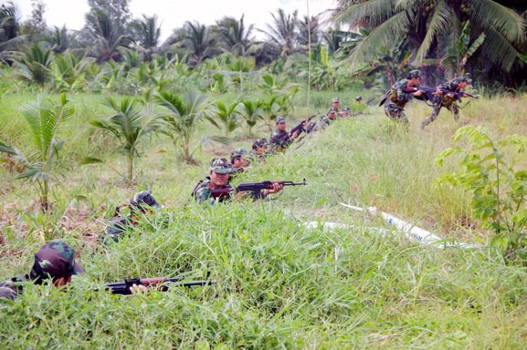 Lực lượng dự bị động viên tham gia thực binh trong diễn tập khu vực phòng thủ huyện Châu Thành năm 2018. Ảnh: Đặng Thạch